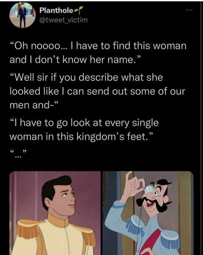 minus-squareIlovethebomb@sh.itjust.workslinkfedilinkarrow-up0arrow-down1·12 days agoIn the original, it was a fur slipper, and the prince went around the nation kneeling down in front of women to check if the fur slipper fit. Yes, the “fur slipper” was slang for exactly what you think.